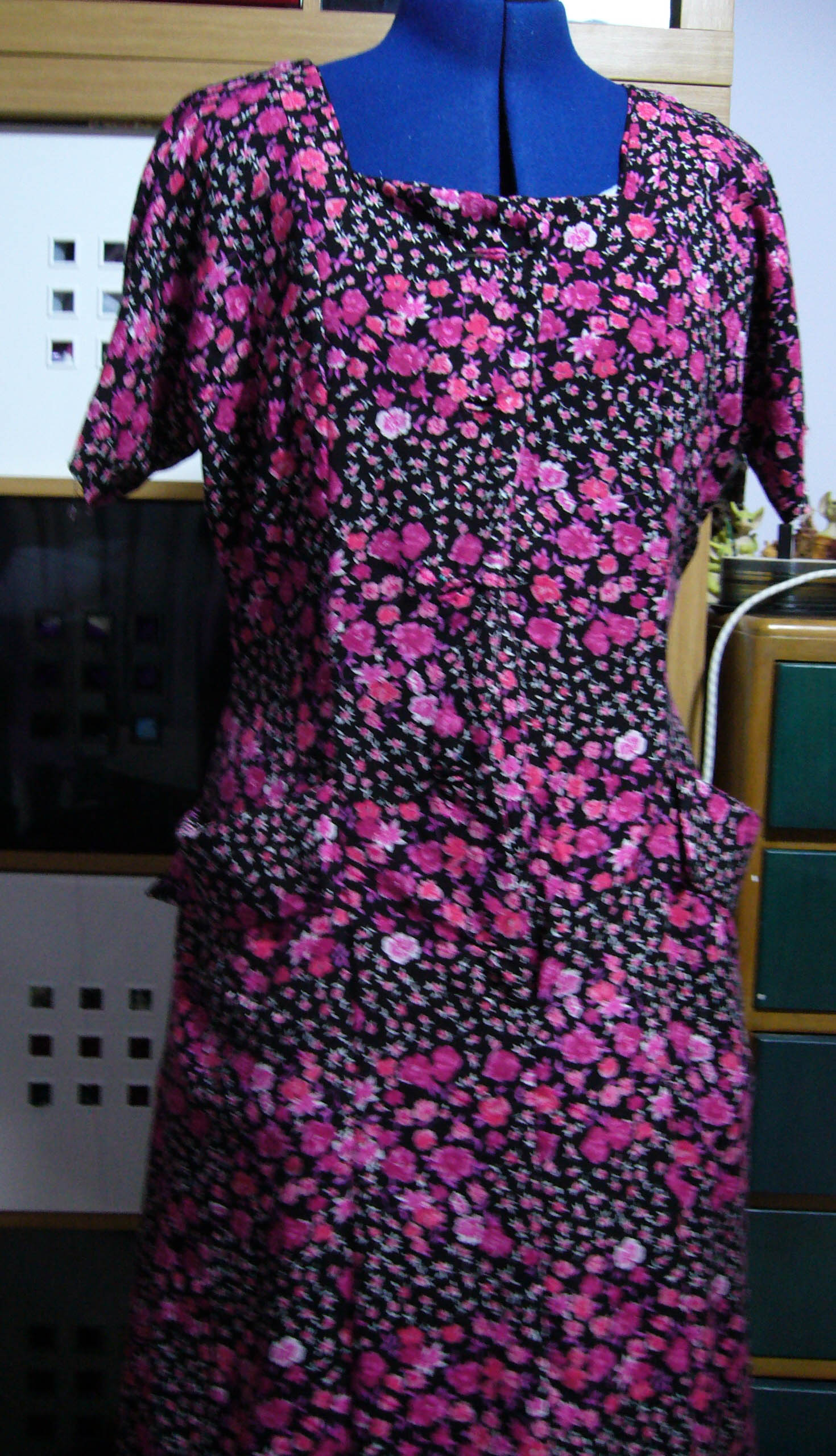 I have now got the whole dress together and the facing has been stitched on, the pockets look uneven but I have measured them and they are the same distance from the shoulder so apparently it is an optical illusion.