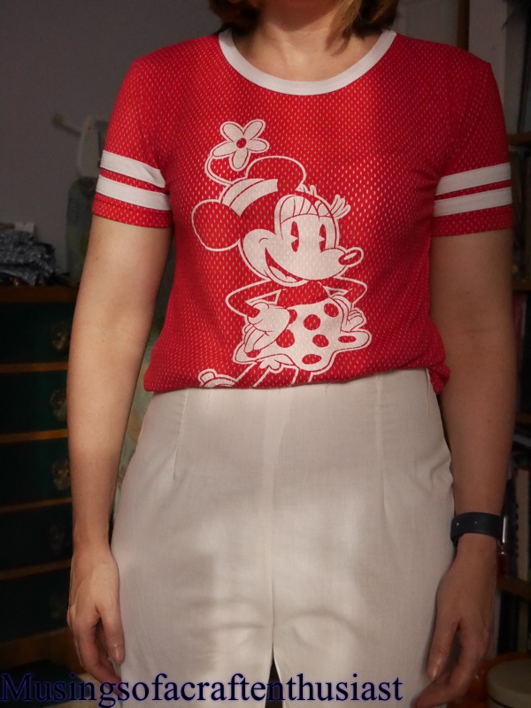 I had a large piece of T-Shirt fabric that I bought last year waiting for Simon to tell me which of his T-Shirts he wanted me to copy which he never got around to (he says I never mentioned it to him). So after printing off the T-shirt pattern and sticking it together I checked the size copied it off and cut out my fabric. Although Meg does say that you could use an Overlocker(serger) for this she exclusively uses a sewing machine.