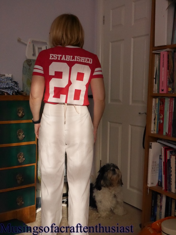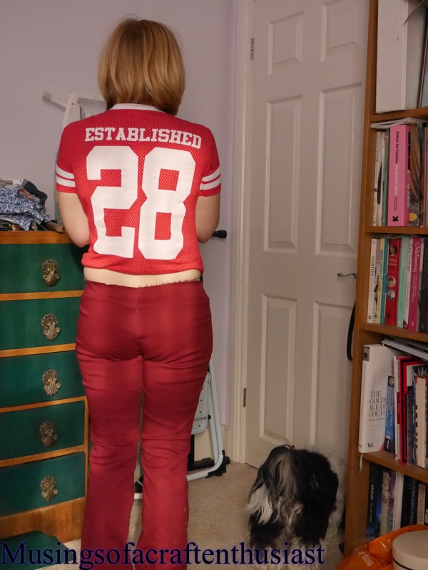 The third goal or goals three and four are to take patterns from these two pairs of trousers. I love these trousers but I wish they had a boot cut hem, they are prepared and I am just waiting for the organza to take a ‘rub off’. I do have some organza already but with everything boxed up I’m not sure where it is.