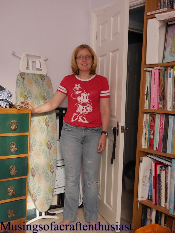Meg showed us how to put on the binding for the neck and put two rows of stitching to hold it down, the sleeves are put in flat and then the side seams and underarms, two rows of stitching are used for the cuff we then use a twin needle for the hem. Full disclosure I put the t-shirt on after sewing the side seams and underarm and decided it was too big, so I haven’t done the finishing off, but I have worn it a lot round the house for slobbing about in and it is very comfortable. When I make the next one it will be in a smaller size.