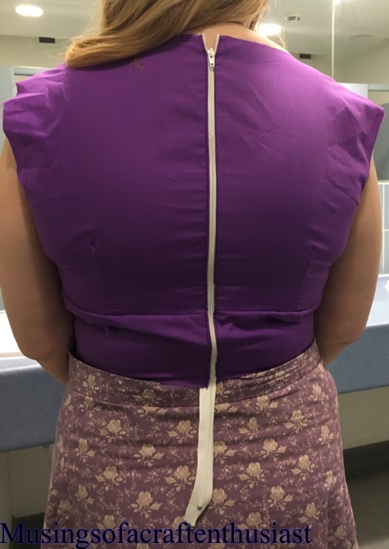 I took the sliver off the back shoulder seam, and cut 5/8 inch off the front. I stitched the bodice to the skirt,but this time I just stitched the fashion fabric, as I am going to slip stitch the lining to the waist seam. I also put in the invisible zip.