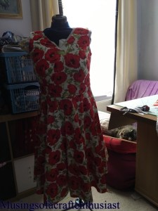 I must admit seeing it sitting there in its poppy glory I did wonder what we had done and what sort of mess I had got Liz into, but once the bodice was attached it looked a lot better. I padded up my dressmakers dummy with a 2 meters of fleece and used the test bodice as a guide.