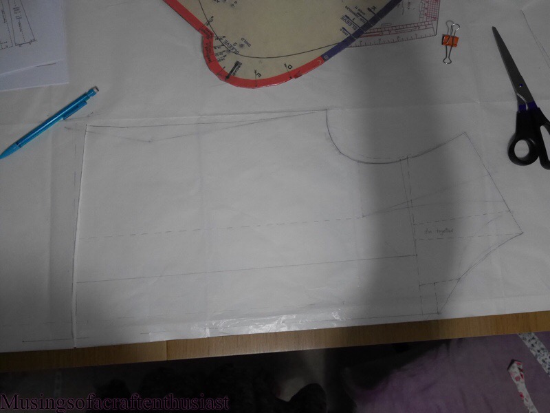 I started by drafting the front block, I used wallpaper lining paper to draft the block, and a pencil, I strongly advise using a pencil, the first time I attempted to do this, I used coloured pens for the different types of line and got my self into a right old mess. 🙂 this way if you make a mistake or get confused it is easy to erase it and start again.
