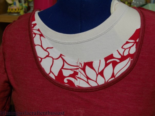 After I cut off the excess I had then had to decide how to finish it off. Too be honest I didn’t look at the instructions on the pattern at this point, and I didn’t when I made the first one. The Craftsy class I took had you fold the neck strip in half, stitch it to the neck line and topstitch it in place, I didn’t like the mess it left inside so I decided to do it a different way.