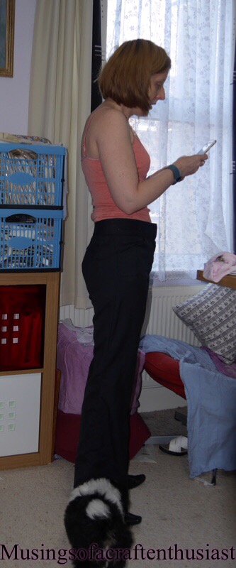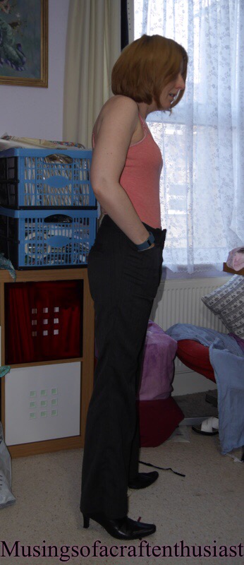 which I don’t think looks too bad, even though I fudged putting the waist on, which you can see in the way the seams don’t line up. you can also see from this picture that I didn’t take up the pattern before cutting out, I have taken two inches out of the length I should probably take another half inch out but I do like to wear my trousers long.