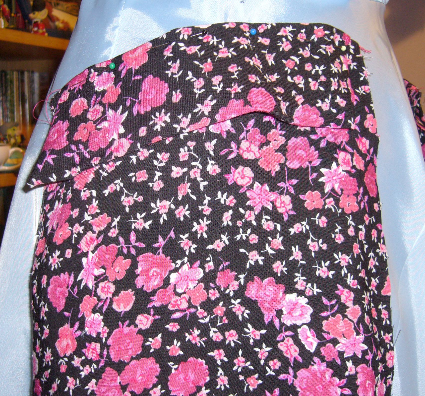 I decided to reinforce the pockets as I did not want them to stretch as you can see by the black ribbon I have carefully reinforced the seam with, the lower part of the top part of the dress forms the back of the pocket.