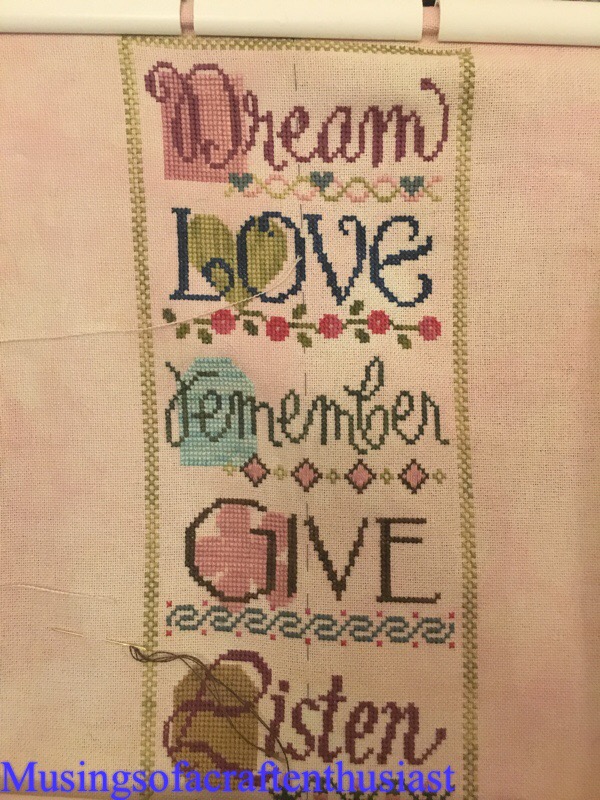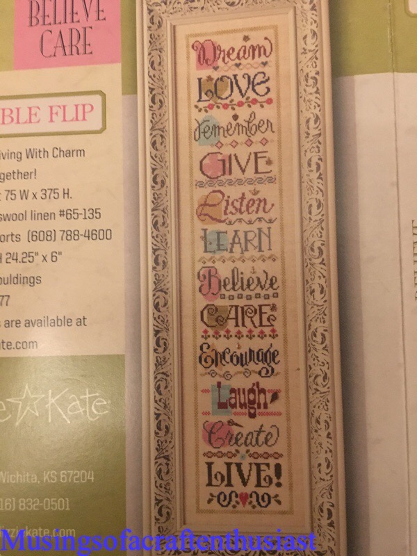 I decided to go with the easiest cross stich I had started (out of at least half a dozen), which was a Lizzie Kate ‘sampler’ this particular sampler is made up out of 6 double flip living with charm charts, each chart has two words and a bit of decoration for each and a charm to be stitched on last..